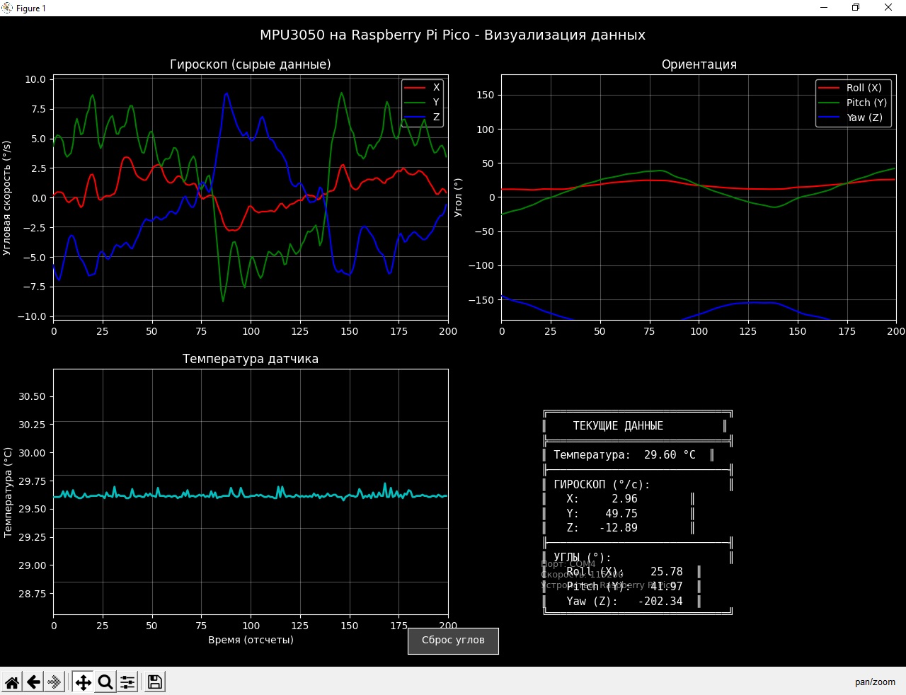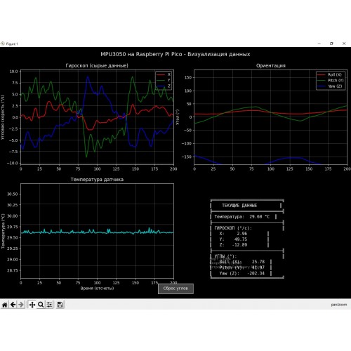 Разработана полноценная система для сбора, обработки и визуализации данных с трехосевого MEMS-гироскопа MPU3050C (аналог MPU3050) в реальном времени. Проект включает в себя прошивку для микроконтроллера Raspberry Pi Pico (RP2040) и десктопное приложение на Python с графическим интерфейсом.